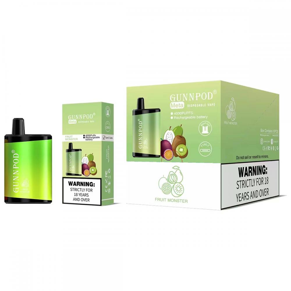 Gunnpod meta 4000 เป็นอุปกรณ์ vape แบบใช้แล้วทิ้ง ประกอบด้วย น้ำ e-juice เกลือนิค 5% 14 มล . และ vape มากถึง 4,000 พัฟ มี 12 รสชาติให้คุณเลือก. ไฟ RGB ทำให้เป็นอุปกรณ์แบบใช้แล้วทิ้งที่เจ๋งที่สุด อีกทั้งยังมาพร้อมกับพอร์ต usb แบบชาร์จไฟได้ที่ด้านล่างของอุปกรณ์ ซึ่งรับประกันว่าคุณจะดื่มน้ำหยดสุดท้ายในถังและมีแสงส่องสว่างอยู่ตลอดเวลา
