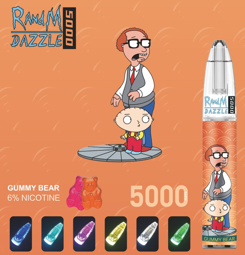 แรนด์เอ็ม แดซเซิล 5000 เป็นอุปกรณ์ vape แบบใช้แล้วทิ้งที่มีถังใสยอดนิยม มีไฟ RGB สีสันสดใส และสามารถรีฟิลได้ ประกอบด้วย น้ำนิคเกลือ e-juice 0/2/3/5% ขนาด 10 มล. และสูบไอได้มากถึง 5,000 พัฟ มี 20 รสชาติให้คุณเลือก. ไฟ RGB ทำให้เป็นอุปกรณ์ที่ใช้แล้วทิ้งที่เจ๋งที่สุด อีกทั้งยังมาพร้อมกับพอร์ต usb แบบชาร์จไฟได้ที่ด้านล่างของอุปกรณ์ ซึ่งรับประกันว่าคุณจะดื่มน้ำหยดสุดท้ายในถังและมีแสงส่องสว่างอยู่ตลอดเวลา