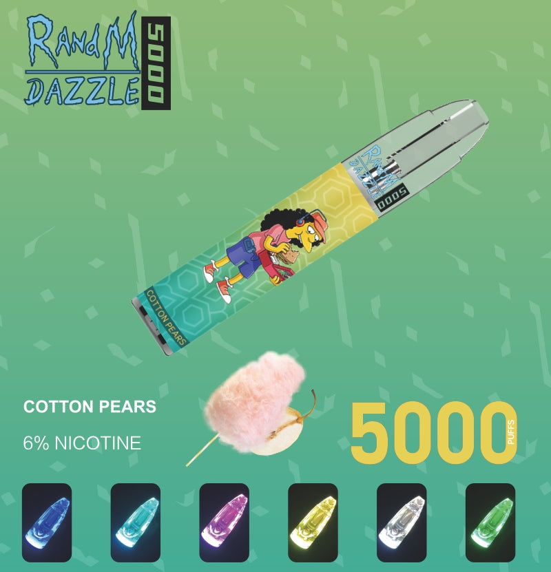 แรนด์เอ็ม แดซเซิล 5000 เป็นอุปกรณ์ vape แบบใช้แล้วทิ้งที่มีถังใสยอดนิยม มีไฟ RGB สีสันสดใส และสามารถรีฟิลได้ ประกอบด้วย น้ำนิคเกลือ e-juice 0/2/3/5% ขนาด 10 มล. และสูบไอได้มากถึง 5,000 พัฟ มี 20 รสชาติให้คุณเลือก. ไฟ RGB ทำให้เป็นอุปกรณ์ที่ใช้แล้วทิ้งที่เจ๋งที่สุด อีกทั้งยังมาพร้อมกับพอร์ต usb แบบชาร์จไฟได้ที่ด้านล่างของอุปกรณ์ ซึ่งรับประกันว่าคุณจะดื่มน้ำหยดสุดท้ายในถังและมีแสงส่องสว่างอยู่ตลอดเวลา