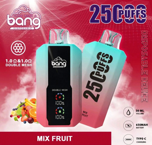 สัมผัสกับ VAPE ที่ใช้แล้วทิ้ง Bang 25000 ซึ่งมีขดลวดตาข่าย1.0Ω, แบตเตอรี่แบบชาร์จไฟได้ 650mAh พร้อมการชาร์จ Type-C และความจุ e-liquid 30 มล. สำหรับพัฟสูงถึง 25,000 พัฟ หน้าจอ LED แสดงอายุการใช้งานแบตเตอรี่และจำนวนพัฟ มีให้เลือก 12 รสชาติ